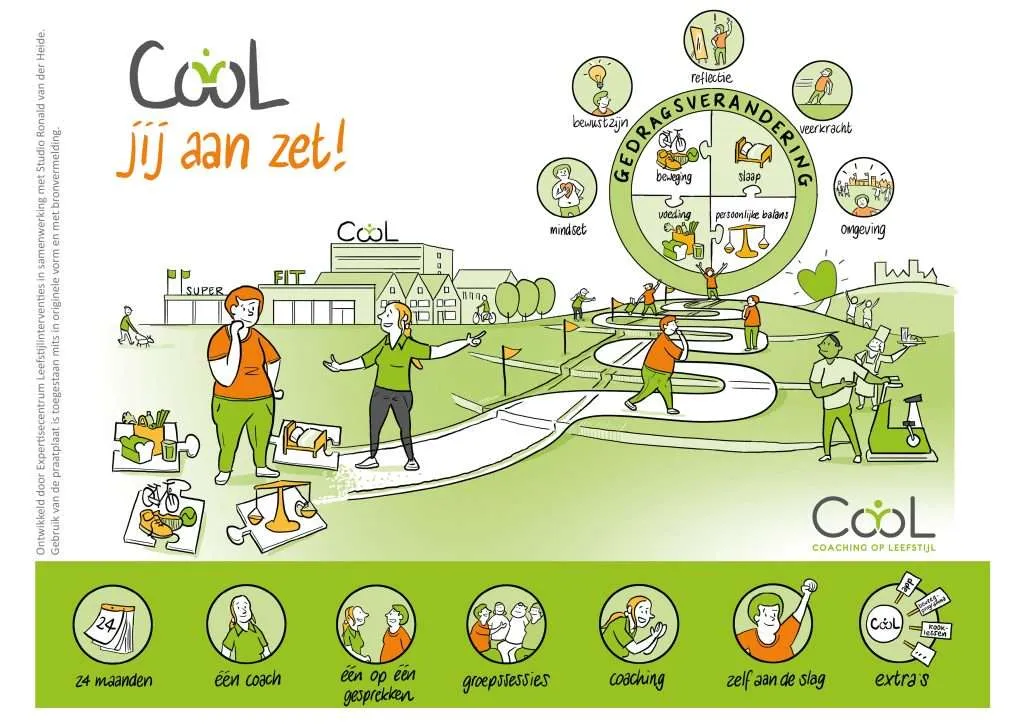 Ons leefstijlcoach programma (CooL) is een tweejarig programma gericht op het bevorderen van een gezonde levensstijl. In tegenstelling tot traditionele diëten, richt CooL zich op het verbeteren van diverse aspecten zoals voeding, beweging, slaap en stressmanagement. Het programma bestaat uit individuele coachingssessies en groepsbijeenkomsten met maximaal 15 deelnemers, die plaatsvinden op onze locatie.